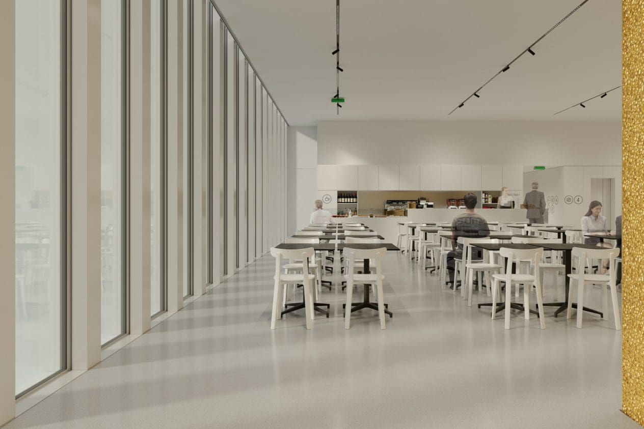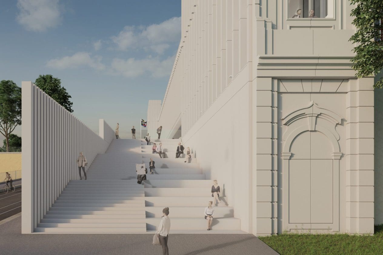O projeto contempla o fecho da ala Poente do Palácio com uma implantação que vai respeitar os limites atuais da massa edificada do palácio. A nova fachada Poente, com desenho e expressão contemporânea, procura restituir a unidade de leitura do conjunto. É utilizada uma composição formal, com referências aos alçados pré existentes, onde se enfatizam as linhas verticais e horizontais, acentuando a marcação da leitura dos estágios das fachadas existentes, que se materializam em diferentes planos das lâminas verticais de sombreamento dos planos envidraçados.