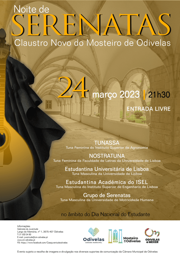 A Câmara Municipal de Odivelas vai assinalar o Dia Nacional do Estudante, na próxima sexta-feira, dia 24 de março. Desta forma, irá celebrar a efeméride com uma Noite de Serenatas Estudantis, no Claustro Novo do Mosteiro de Odivelas, pelas 21h30.