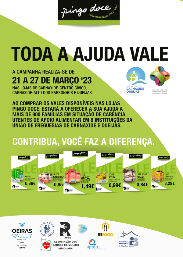 3Entre os dias 21 e 27 de março, a União de Freguesias de Carnaxide e Queijas (UFCQ) vai realizar uma campanha de apoio alimentar, intitulada “Toda a Ajuda Vale”. Por sua vez, esta é realizada em parceria com a cadeia de distribuição alimentar Pingo Doce.