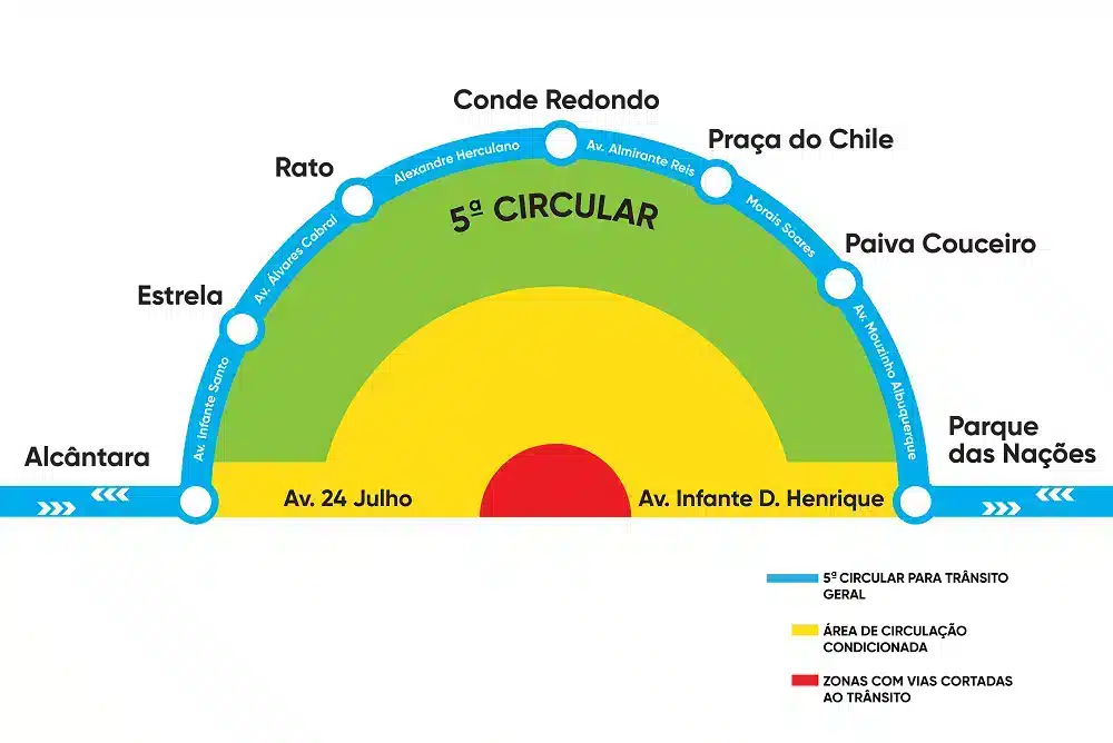 Por isso, a autarquia criou uma ‘5ª Circular’, que liga as seguintes vias: Av. Infante Santo – Praça da Estrela – Largo do Rato – Rua Alexandre Herculano – Rua do Conde de Redondo – Av. Almirante Reis – Praça do Chile – Rua Morais Soares – Praça Paiva Couceiro – Av. Mouzinho de Albuquerque.