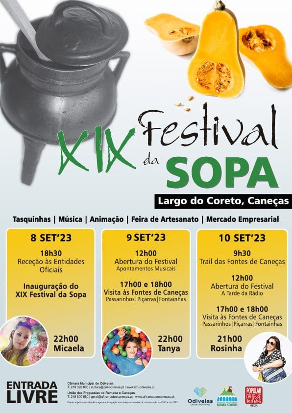 As inscrições já estão abertas e esta iniciativa conta com o apoio da União das Freguesias de Ramada e Caneças e da WeRun. No entanto, a abertura oficial deste dia do Festival da Sopa será três horas depois, pelas 12h00, com a ‘Tarde da Rádio’. Novamente, às 17h00 e 18h00, haverá mais uma visita às Fontes de Caneças. Por fim, às 21h00, a cantora Rosinha inicia o seu concerto.