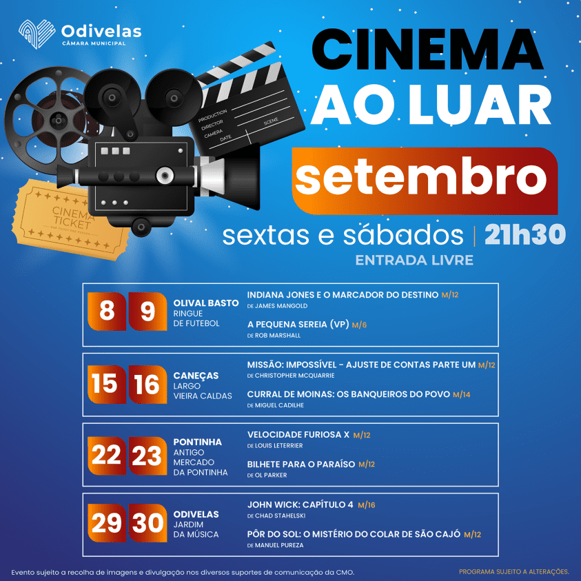 Entre os dias 8 a 30 de setembro, o concelho de Odivelas volta a receber a iniciativa ‘Cinema ao Luar’, com várias sessões de cinema ao ar livre em vários locais do concelho. A entrada é gratuita e todas as exibições decorrem às sextas-feiras e sábados, sempre às 21h30.