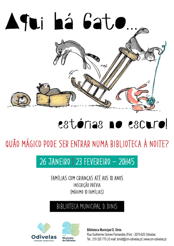 Por sua vez, a segunda sessão está marcada para o dia 23 de fevereiro. ‘Aqui Há Gato’ traz a história de dois gatos muito peculiares que vivem no meio dos livros e desfiam estórias no escuro. Ao mesmo tempo, eles brincam com os contos e ronronam poesia. Por fim, a Biblioteca Municipal D. Dinis funciona na antiga Quinta de Nossa Senhora do Monte do Carmo, que data da segunda metade do século XVII. O espaço é gerido pela Câmara de Odivelas e foi inaugurado a 22 de novembro de 1997.