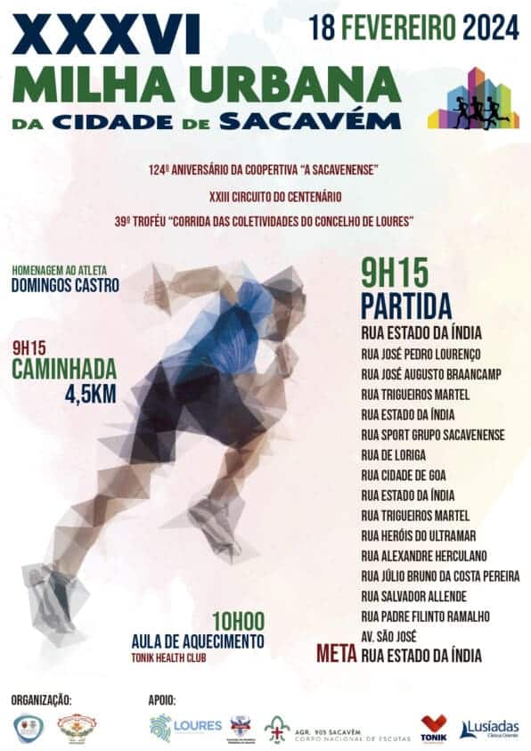 Sacavém vai receber, no próximo domingo, 18 de fevereiro, a XXXVI Milha Urbana da Cidade de Sacavém – XXIII Circuito do Centenário. Esta corrida está integrada no 39º Troféu Corrida das Coletividades do Concelho de Loures. Por sua vez, vai contar com a participação de atletas de todos os escalões, com idades compreendidas entre os sete e os 70 anos de idade. Igualmente, tem como principal objetivo incentivar a participação de todos para a prática de desporto.