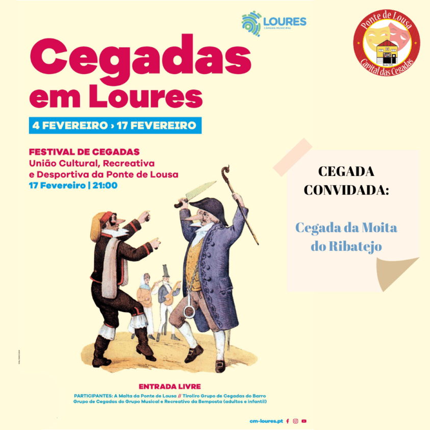 Entre os dias 4 a 12 de fevereiro, os vários grupos de cegadas do concelho de Loures vão sair à rua para animar a população e manter uma das tradições mais antigas do Carnaval Saloio. No dia 17, sábado, está ainda marcado o Festival de Cegadas, na sede da União Cultural Recreativa e Desportiva da Ponte de Lousa.