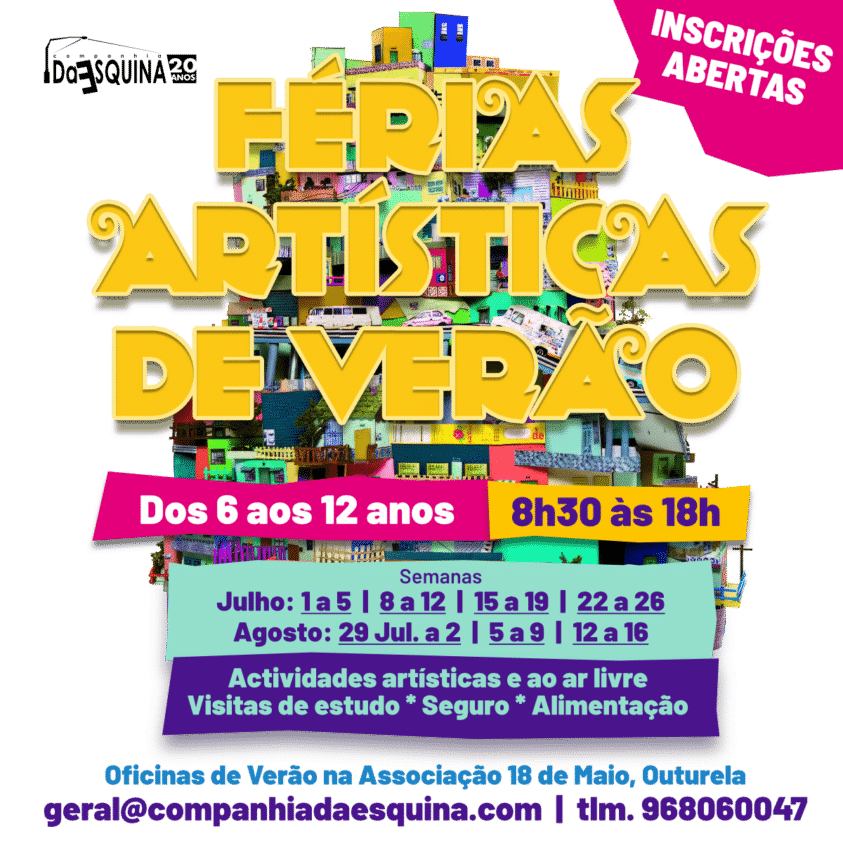 Nos meses de julho e agosto, a Companhia da Esquina vai dinamizar, no bairro da Outurela, em Carnaxide, a oficinal Férias Artísticas, cujo objetivo é ocupar as crianças entre os seis e os 12 anos, com atividades desportivas, de lazer e culturais como teatro, dança e circenses.