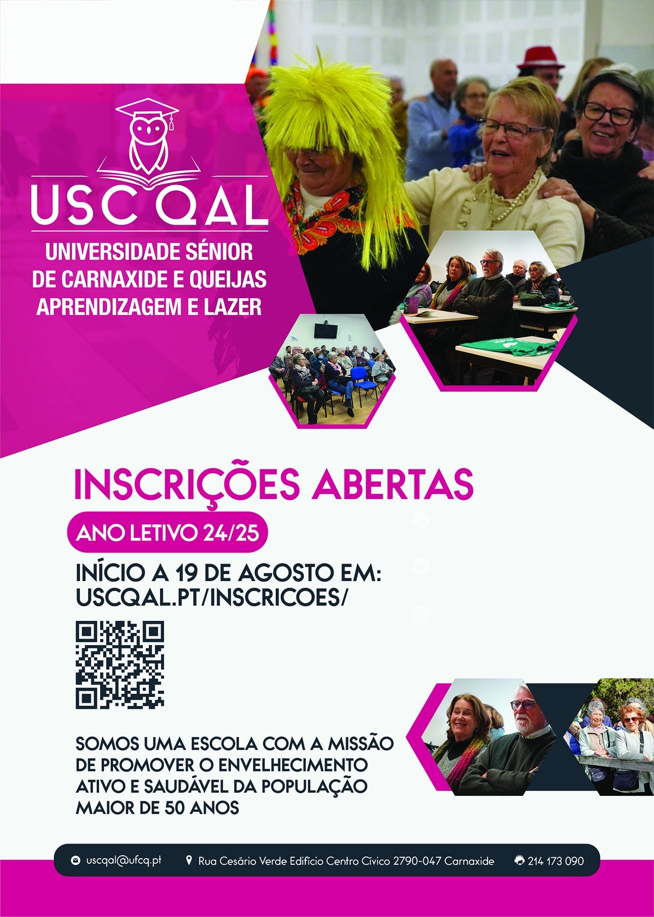 Se tem mais de 50 anos, já pode inscrever-se na Universidade Sénior de Carnaxide e Queijas (USCQAL), que já abriu as inscrições para o ano letivo de 2024/2025 na última segunda-feira, 19 de agosto. Para formalizar a sua presença, deverá aceder ao site www.uscqal.pt/inscricoes ou ligar para o número 214173090. As universidades séniores têm como objetivo promover o envelhecimento ativo das pessoas com mais de 50 anos, combatendo ao mesmo tempo o isolamento.