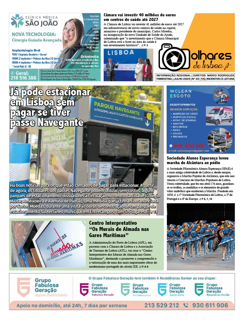Estamos em agosto, mês por excelência das férias e do descanso. O bom tempo e os dias compridos convidam a ir até à praia ou a uma esplanada. E enquanto aprecia uma bebida fresquinha, aproveite para ler, na versão impressa, a nova edição de Olhares de Lisboa, também disponível, gratuitamente, em alguns estabelecimentos do comércio local, nas caixas do correio e nas juntas de freguesia da cidade. Se quiser receber o seu exemplar em casa, pode ainda fazer uma assinatura anual do Olhares de Lisboa.