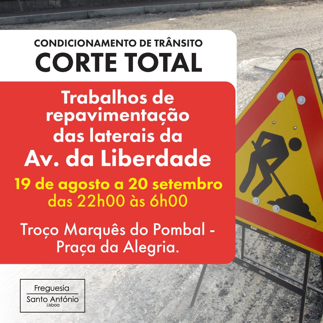 A Câmara Municipal de Lisboa (CML) vai, a partir da próxima segunda-feira, 19 de agosto, iniciar os trabalhos de repavimentação das laterais da Avenida da Liberdade. Esta empreitada fazer-se-à por troços, no horário das 22h00 às 06h00 e terminará a 20 de setembro.