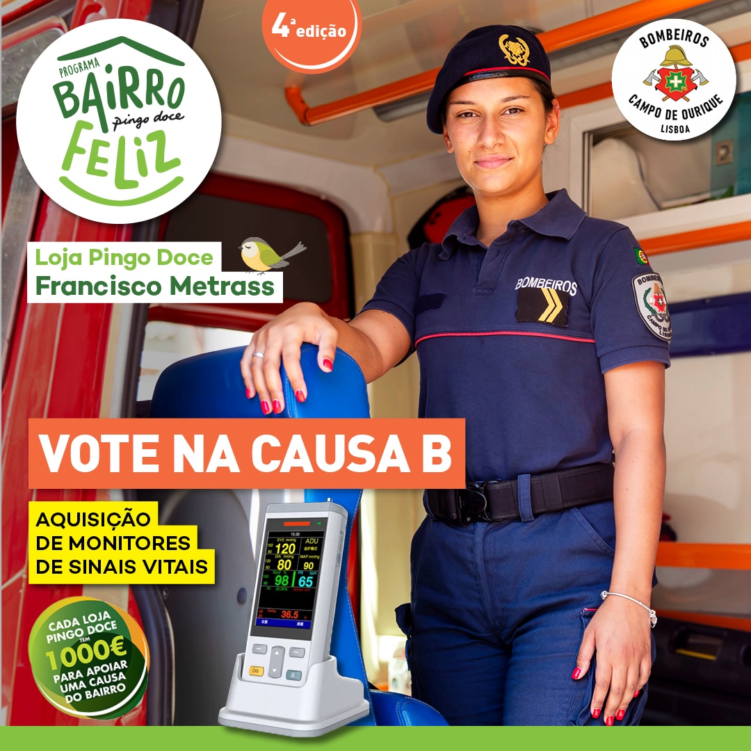 Encontra-se a decorrer a quarta edição do programa ‘Bairro Feliz’, patrocinado pela cadeia de supermercados Pingo Doce. Em Campo de Ourique, na loja da Rua Francisco Metrass, uma das causas a votos é dos Bombeiros Voluntários de Campo de Ourique, que apelam à sua votação para a aquisição de três monitores de sinais vitais.