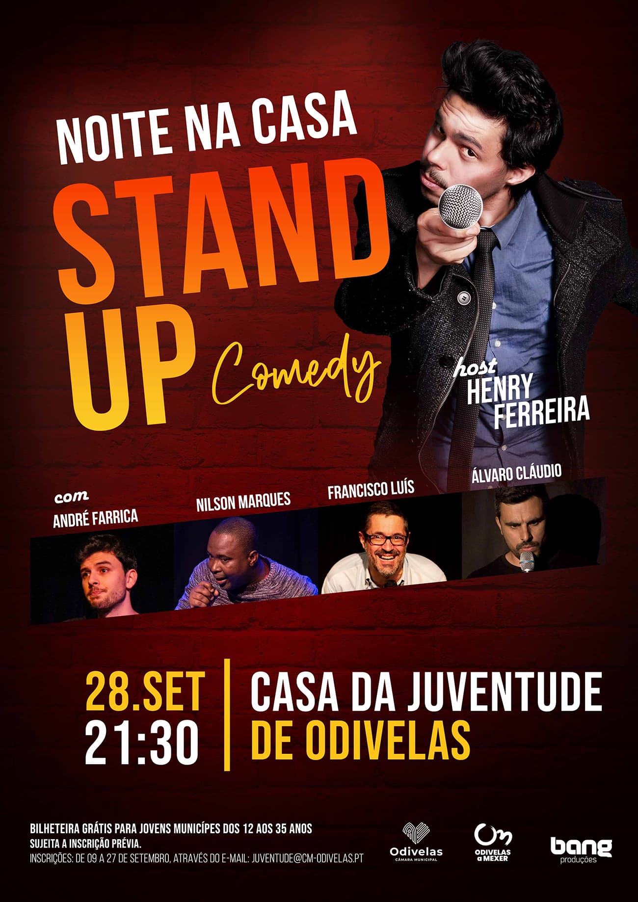 No próximo dia 28 de setembro, a Casa da Juventude de Odivelas recebe o espetáculo ‘Noite na Casa – Stand Up Comedy’, a partir das 21h30. Este evento é promovido pela Câmara Municipal de Odivelas e a Bang Produções, e contará com a apresentação de Henry Ferreira e participação de André Farrica, Nilson Marques, Francisco Luís e Álvaro Cláudio, prometendo muito humor e diversão.