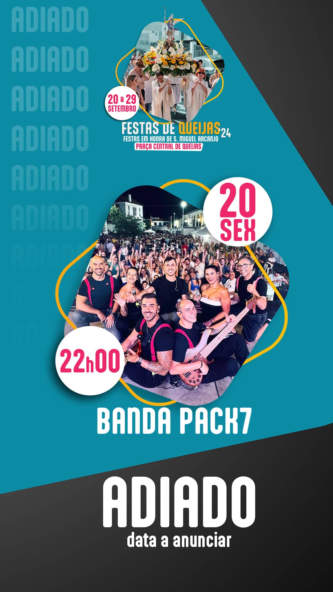 A Banda Pack7, prevista para atuar na noite desta sexta-feira, 20 de setembro, no palco das Festas em Honra de São Miguel Arcanjo, em Queijas, vai realizar o seu concerto numa data a anunciar em breve, informou a União de Freguesias de Carnaxide e Queijas (UFCQ), que decidiu adiar este espetáculo devido ao Dia de Luto Nacional, decretado pelo Governo, e na sequência das mortes provocadas pelos incêndios que decorrem no norte do país. Às 22h00, hora do concerto agora adiado, no palco do recinto, será prestada uma homenagem às vítimas e também aos bombeiros que continuam a lutar para defender pessoas, património e território, cerimónia para a qual se convida toda a população a estar presente.