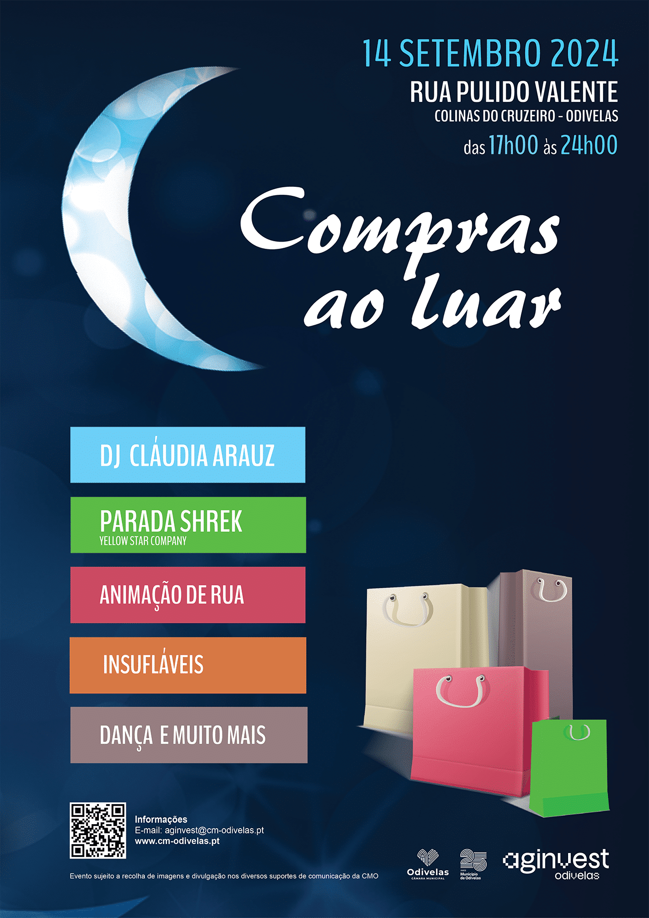 No próximo sábado, dia 14 de setembro, entre as 17h00 e as 24h00, regressa a Odivelas a iniciativa ‘Compras ao Luar’, uma iniciativa da Câmara Municipal que promove o comércio local em horário noturno na Rua Pulido Valente, Colinas do Cruzeiro. Nesta, que será a oitava edição do evento, haverá animação de rua, insufláveis para os mais novos, paradas e atuações musicais, dança e muito mais.