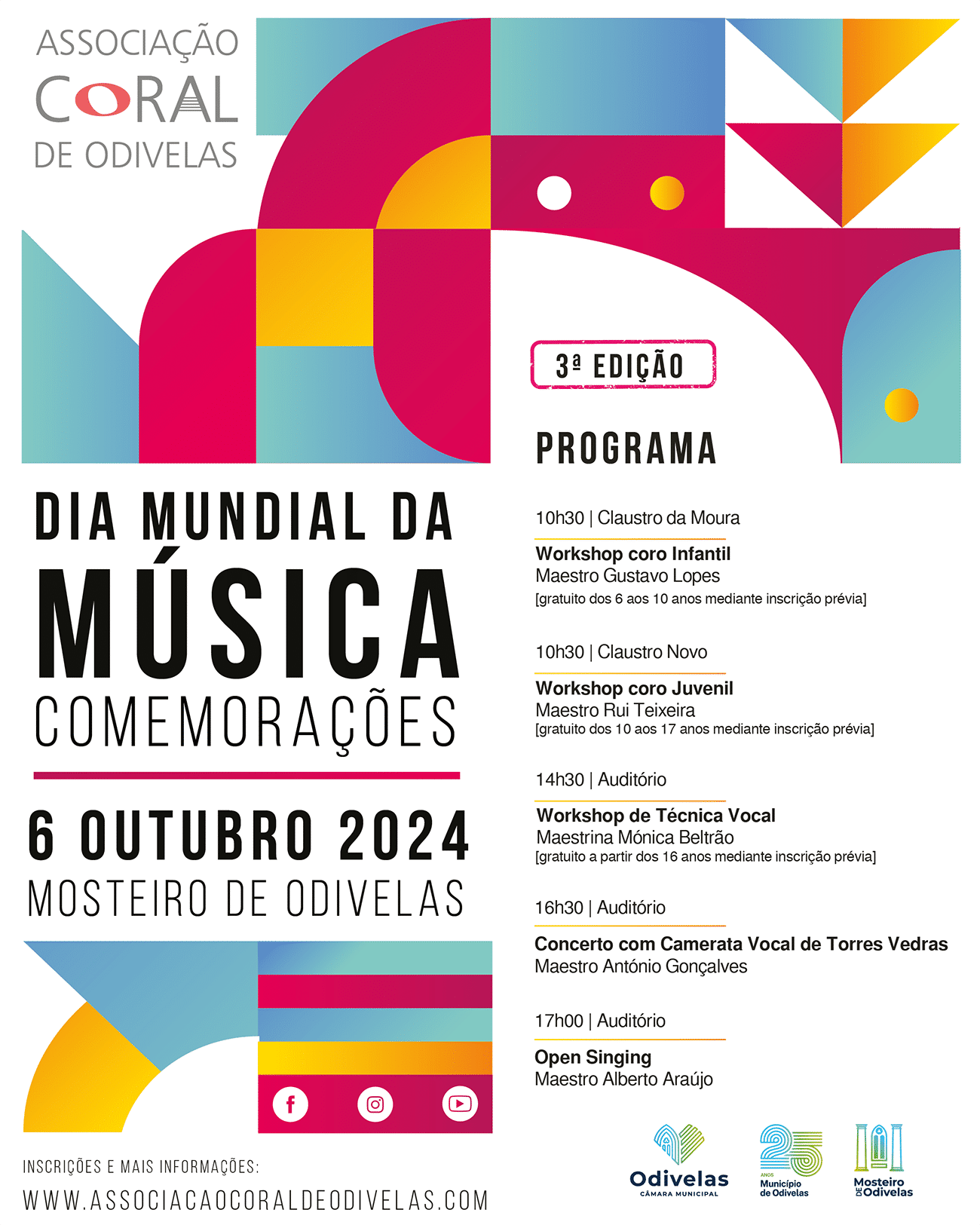 Para assinalar o Dia Mundial da Música, a Câmara Municipal de Odivelas (CMO), em parceria com a Associação Coral de Odivelas, promove no próximo domingo, dia 6 de outubro, entre as 10h30 e as 17h45, vários concertos de entrada livre e workshops gratuitos no Mosteiro de Odivelas. A programação começa pelas 10h30 com o workshop de Coro Infantil com o Maestro Gustavo Lopes, no Claustro da Moura, uma ação destinada a crianças dos seis aos 10 anos.