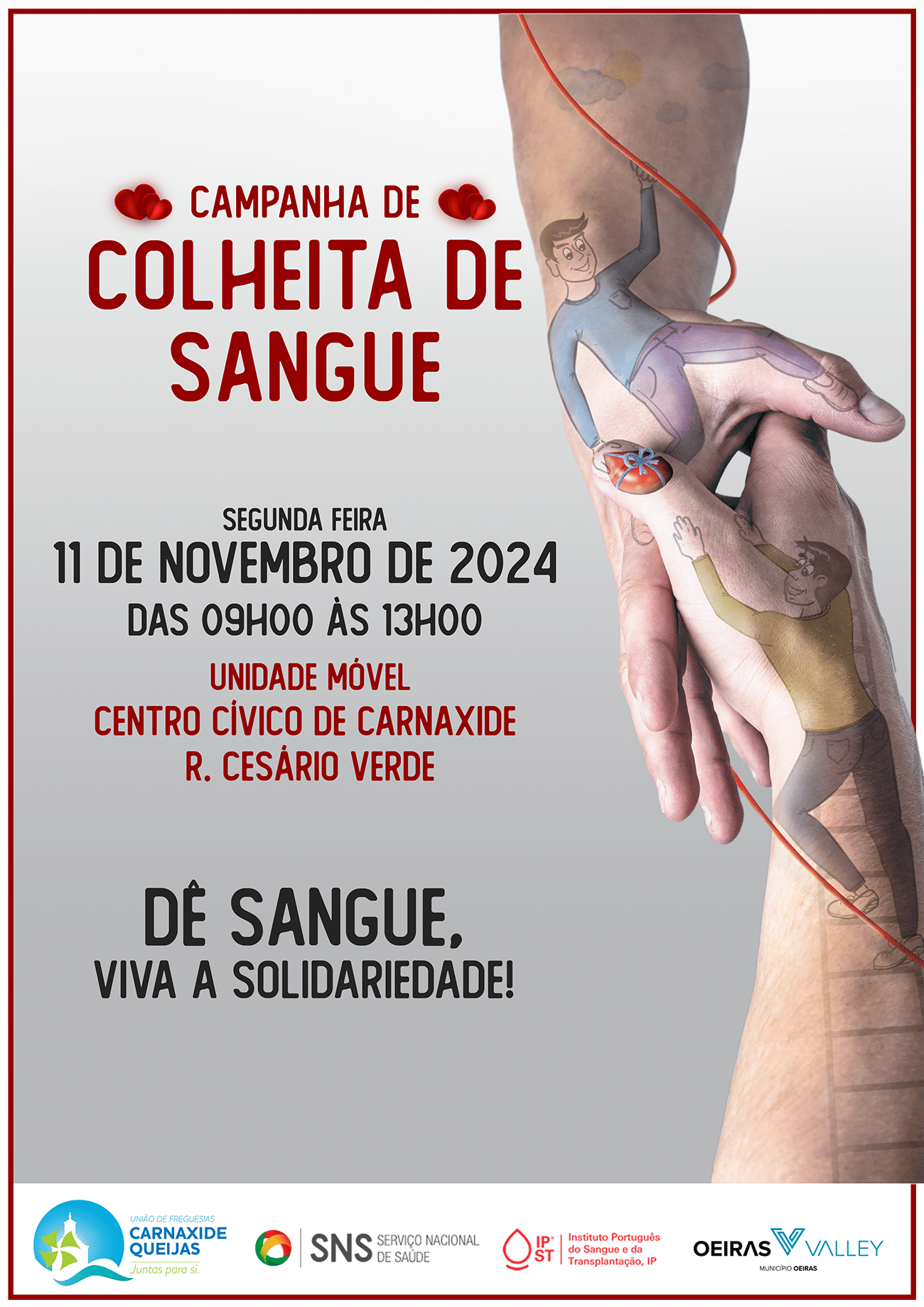 Na próxima segunda, 11 de novembro, a União de Freguesias de Carnaxide e Queijas (UFCQ) vai promover, em parceria com o Instituto Português do Sangue e da Transplantação (IPST), uma ação de recolha de sangue, entre as 9h00 e as 13h00, no Centro Cívico de Carnaxide. Esta é uma iniciativa cívica, de carácter gratuito, aberta a toda a comunidade, que também tem o objetivo de alertar para a importância de manter as reservas de sangue em níveis estáveis. Esta ação será a primeira de duas campanhas de dádiva de sangue que vão ser realizadas pela UFCQ ainda neste ano.