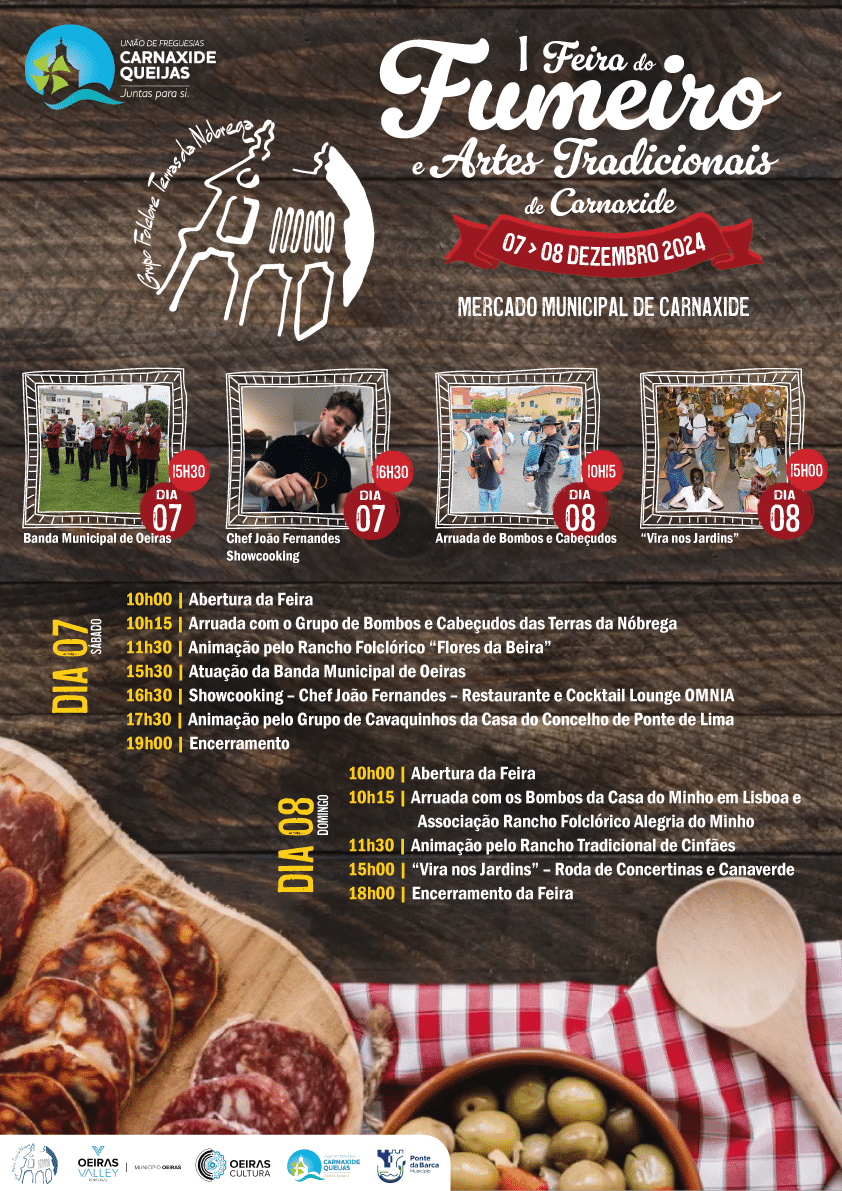 Realiza-se, neste fim-de-semana, dias 7 e 8 de dezembro, a primeira edição da Feira do Fumeiro e Artes Tradicionais de Carnaxide, no Mercado de Carnaxide, que vai levar a todos os visitantes uma grande variedade de produtos curados, com destaque para enchidos e queijos, mas também o melhor do artesanato típico das Terras da Nóbrega, produzida por artesãos da região.