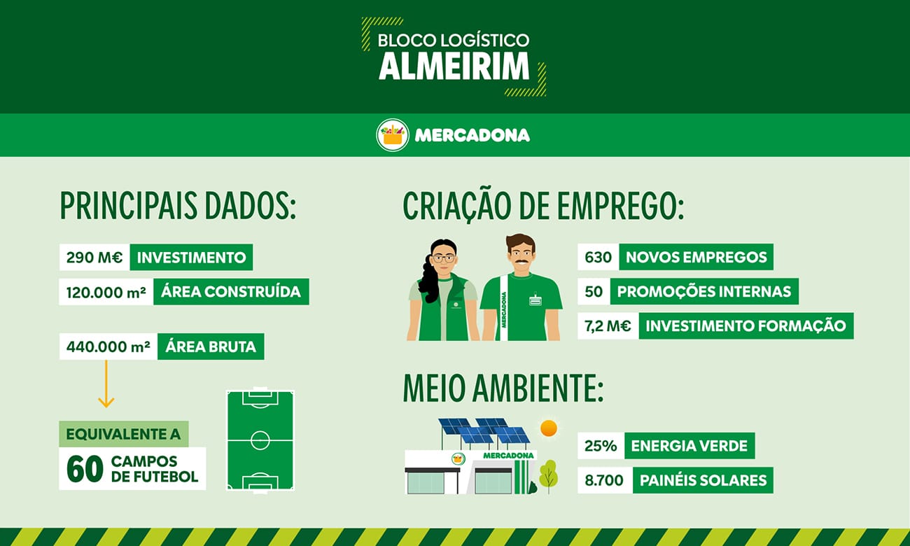A Mercadona iniciou a construção do bloco de Almeirim em 2022, num terreno de 440.000 m2, com uma área total construída de cerca de 120.000 m2, composta por um armazém de frio de 49.000 m2, um de secos de 50.000 m2, um edifício de serviços gerais e escritórios e uma oficina de lojas.