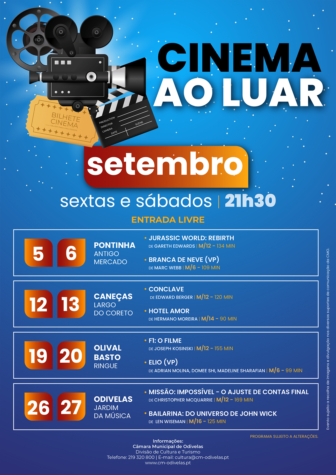 O cartaz deste ano é variado e reflete o gosto popular. No dia 5 de setembro, no antigo Mercado (Pontinha), vai ser projetado o filme “Jurassic World: Rebirth”; no dia 6 de setembro, passa a película “Branca de Neve”, em Caneças; no dia 12 de setembro, passa a história dos dois últimos Papas, em “Conclave”; no dia 13 de setembro, poderá ver “Hotel Amor”, ambas as projeções estão programadas para Olival de Basto; no dia 19 de setembro, os amantes do desporto automóvel poderão sentir a “adrenalina” de “F1: O Filme”; já no dia 20 de setembro é a vez de “Elio”, no Jardim da Música (Odivelas); no dia 26 de setembro, Tom Cruise assume mais uma “Missão: Impossível – O Ajuste de Contas Final”; no dia 27 de setembro, a ação extrema é levada à tela pela película “Bailarina: Do Universo de John Wick”, filme este em que Keanu Reeves distribui socos e pontapés a quem se interpõe no caminho, mas também esquiva balas com a facilidade de quem come um pastel de nata.