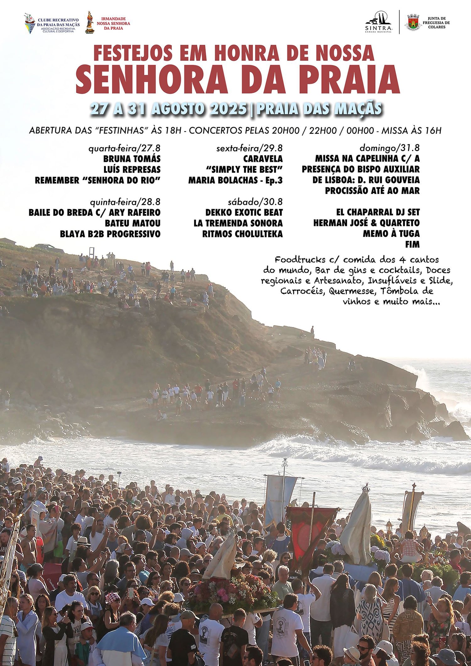 Este ano, a programação aposta forte na música. A abertura faz-se com Luís Represas (27 agosto), um dos nomes mais acarinhados da música portuguesa. Já a despedida, no dia da procissão, conta com Herman José & Quarteto (31 ago), em registo musical e humorístico. Entre estes artistas, o cartaz inclui ainda o ritmo eletrónico e tribal dos Bateu Matou, e um set explosivo de Blaya (ex-Buraka Som Sistema) com Progressivu, que promete pôr a Praia das Maçãs a dançar ao som de kuduro, afrobeat e eletrónica.