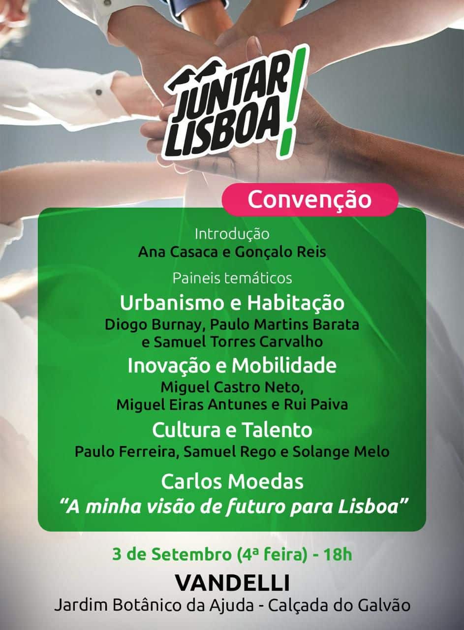 O movimento cívico JuntarLisboa!, criado por um conjunto diverso de cidadãos com experiência técnica e profissional em áreas-chave para o desenvolvimento urbano, cultural e social, realiza no próximo dia 3 de setembro (quarta-feira) a sua primeira Convenção, um encontro de reflexão e debate sobre o futuro da cidade que terá lugar no Vandelli – Jardim Botânico da Ajuda. Carlos Moedas, candidato à presidência da Câmara Municipal de Lisboa, é um dos participantes neste encontro.