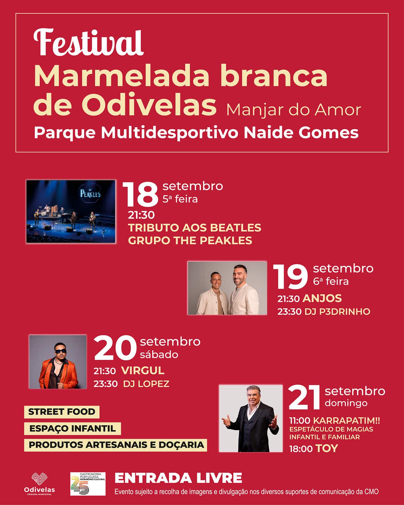 Nos dias 18, 19, 20 e 21 de setembro, o Festival da Marmelada branca de Odivelas – Manjar do Amor, desta vez realizado no Parque Multidesportivo Naide Gomes, é uma ode aos produtores locais, mas também uma celebração da vida.