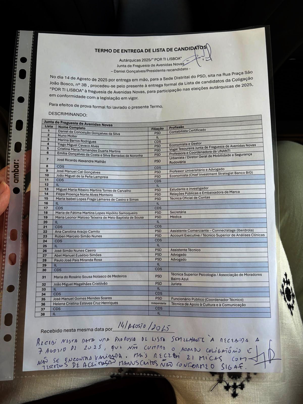 Em entrevista ao OL, Daniel Gonçalves valida a informação recolhida pelo nosso jornal e acrescenta que apresentou a sua lista ao presidente da concelhia do PSD, Luís Newton, mas “o presidente da concelhia não deixou que a lista fosse entregue a outro elemento da estrutura partidária, fazendo questão que lhe fosse entregue a ele próprio, assinando uma cópia a reconhecer que a lista lhe tinha sido entregue”.