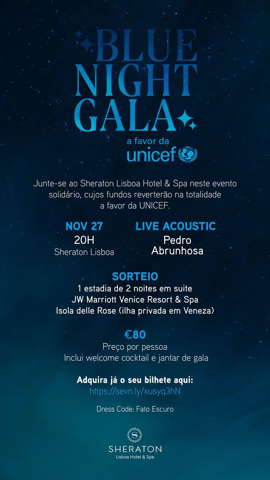 O Sheraton Lisboa Hotel & Spa vai organizar, no próximo dia 27 de novembro, a Blue Night Gala, um jantar solidário cujos fundos angariados reverterão na totalidade a favor da UNICEF. Para tornar a noite ainda mais especial, o evento contará com a atuação do cantor Pedro Abrunhosa e com o sorteio de uma estadia exclusiva de duas noites numa ilha privada em Veneza.