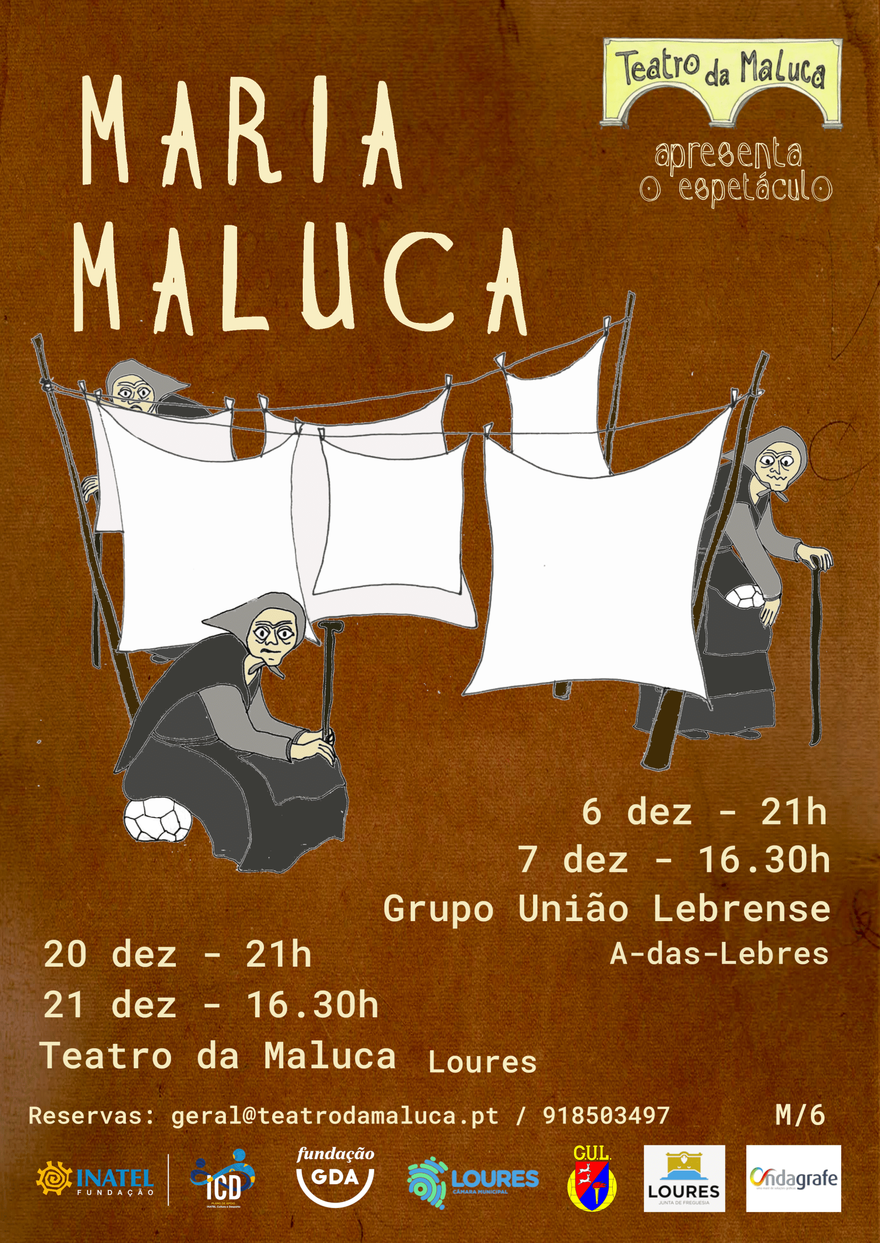 Grupo de Teatro Maria Maluca, de Loures, vai levar à cena uma peça que conta a história do personagem que inspirou este coletivo de atores a criar este grupo. A lavadeira “Maria Maluca”, mulher de mau-feitio, era temida pela criançada da época, mas representa muitas outras “marias” desse Portugal pobre e atrasado, que trabalhavam de sol a sol para sobreviver.