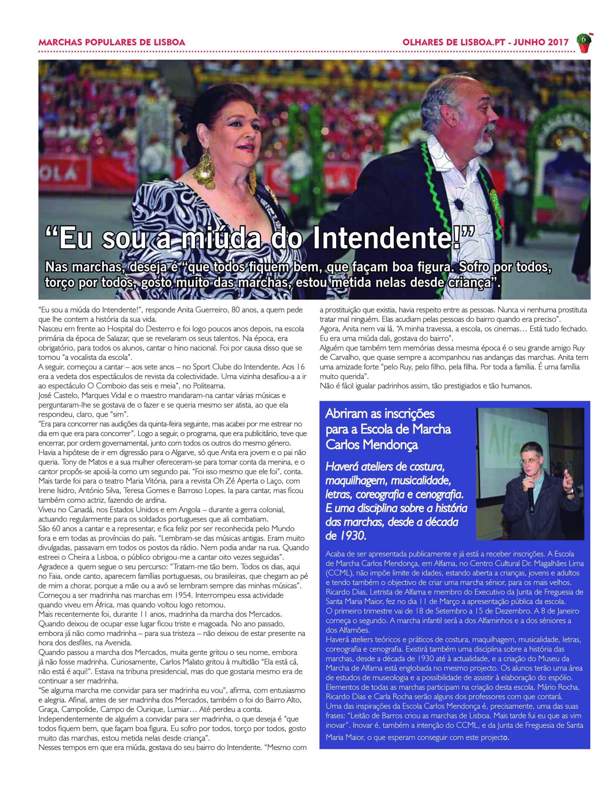 “Também fui Madrinha de muitas marchas populares de Lisboa, entre elas a Marcha dos mercados. Fiz teatro, cinema, televisão e muita avenida abaixo nos Santos Populares. Abri ainda um restaurante e casa de fados, a casa típica Adega da Anita, à entrada do Parque Mayer. Em tudo fui feliz, porque me entreguei com toda a minha alma. Ainda gosto muito de cantar. A voz pode não ser a mesma, mas a alma é”, relembrou a artista que gostava de ser conhecida como “a miúda do Intendente”.