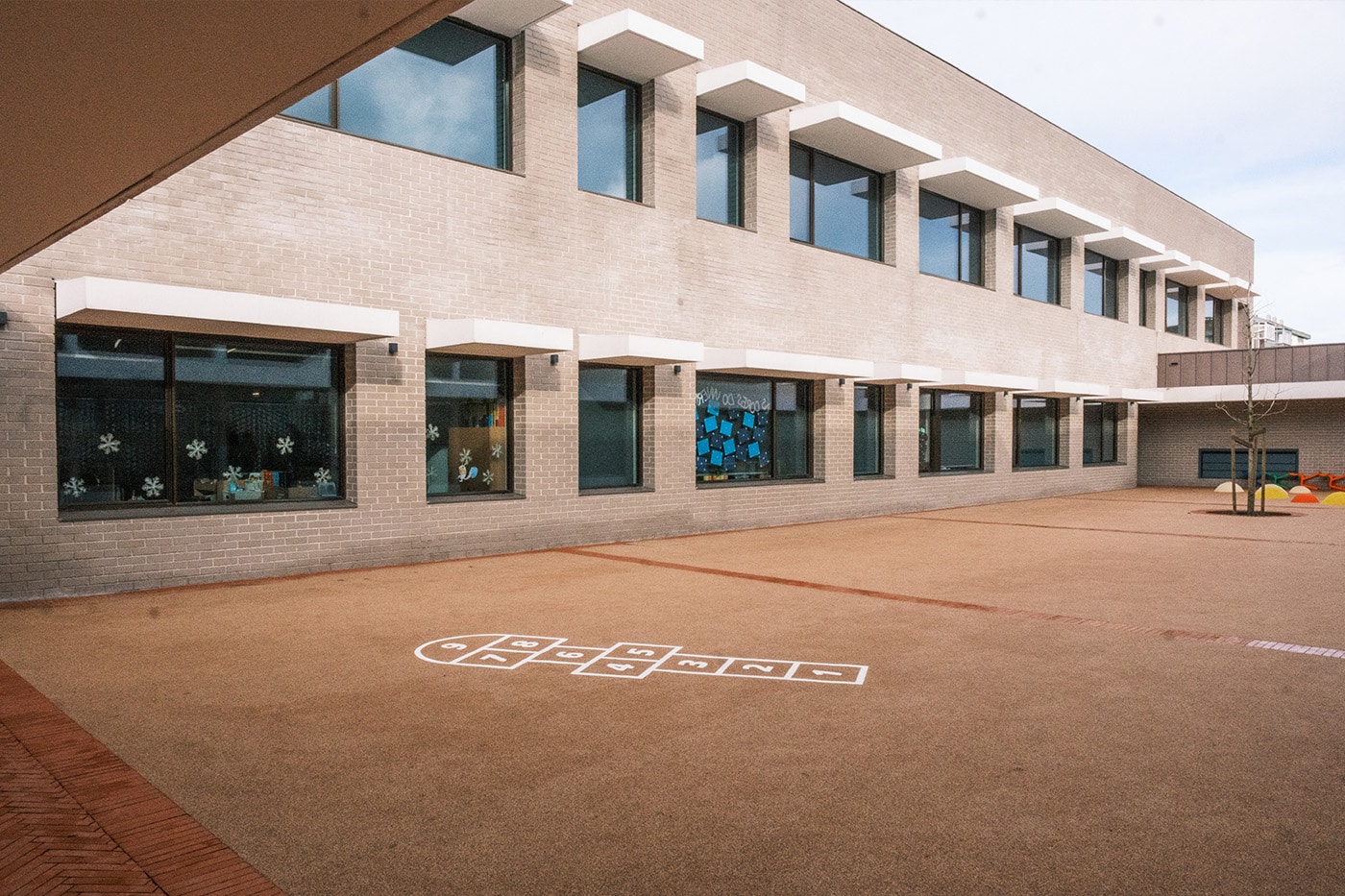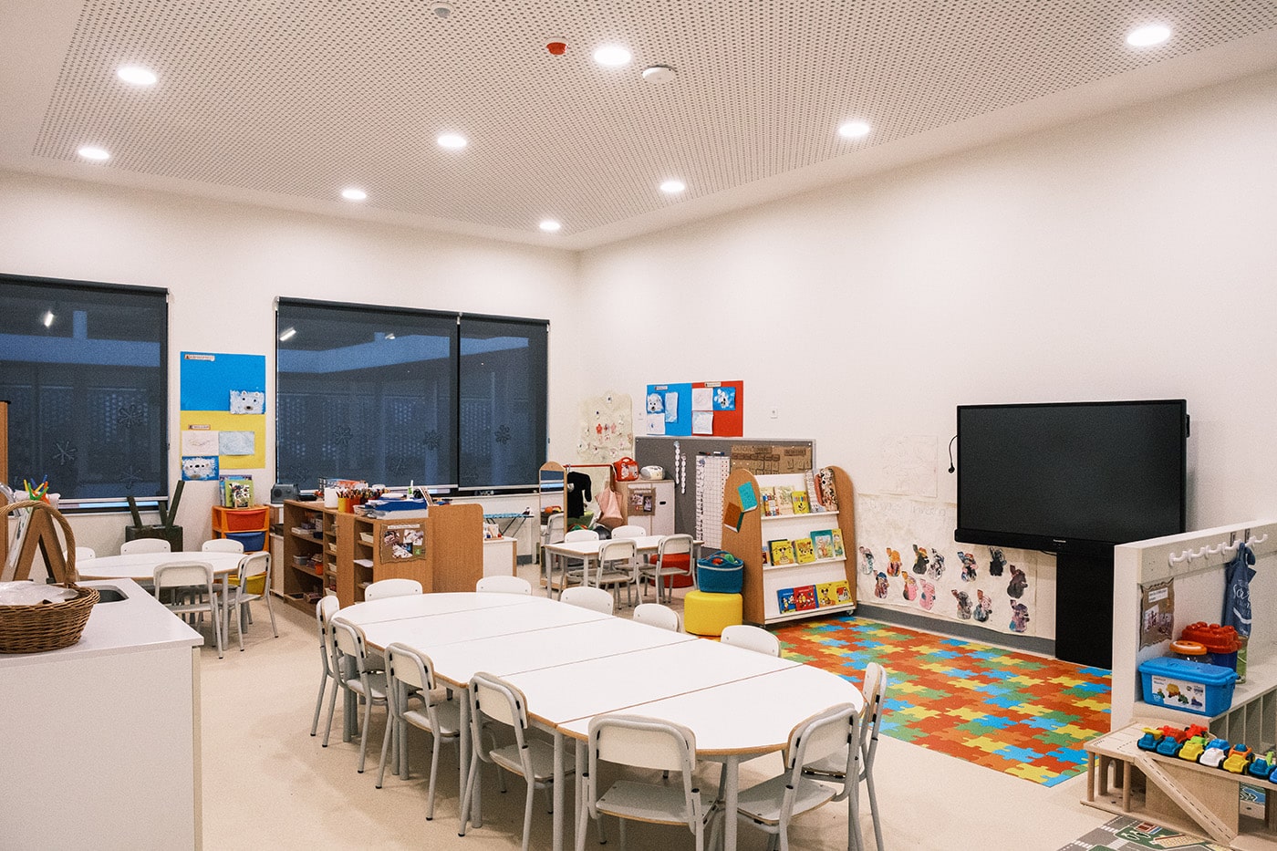 O espaço exterior foi igualmente pensado para promover o bem-estar e o desenvolvimento das crianças, integrando uma horta pedagógica, um campo de jogos coberto e várias zonas de recreio ao ar livre, equipadas com brinquedos.