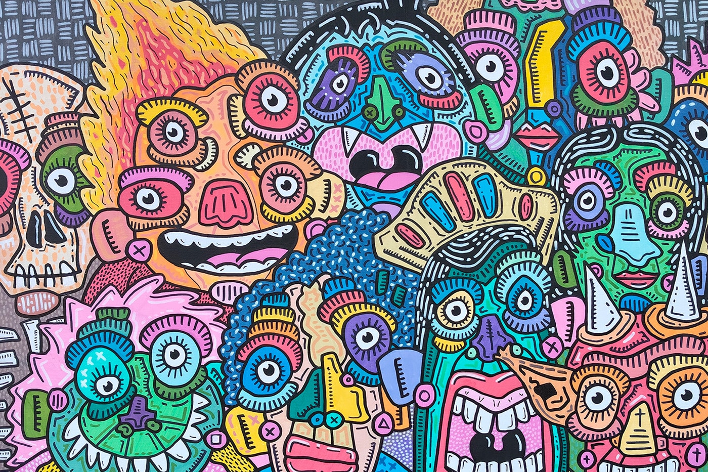 A obra de Ivan é marcada por uma expressividade intensa e vibrante, onde a cor assume um papel central e narrativo, criando composições carregadas de tensões emocionais e movimento. Em ‘Máscaras do Interior’, os fundos servem de paisagens a padrões complexos, com linhas, manchas e texturas que estabelecem ritmos e vibrações em diálogo direto com as figuras principais. A distorção dos retratos é deliberada, incitando o observador a navegar entre o grotesco e o sublime, aproximando familiaridade do estranho.