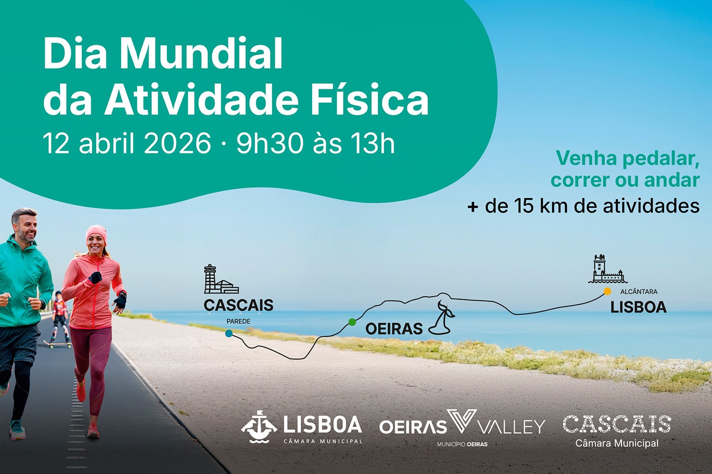 Os municípios de Oeiras, Lisboa e Cascais assinalam o Dia Mundial da Atividade Física no dia 12 de abril, entre as 9h30 e as 13h00, com o encerramento ao trânsito de 15 quilómetros da frente ribeirinha, entre Alcântara (Lisboa) e São Pedro do Estoril (Cascais).