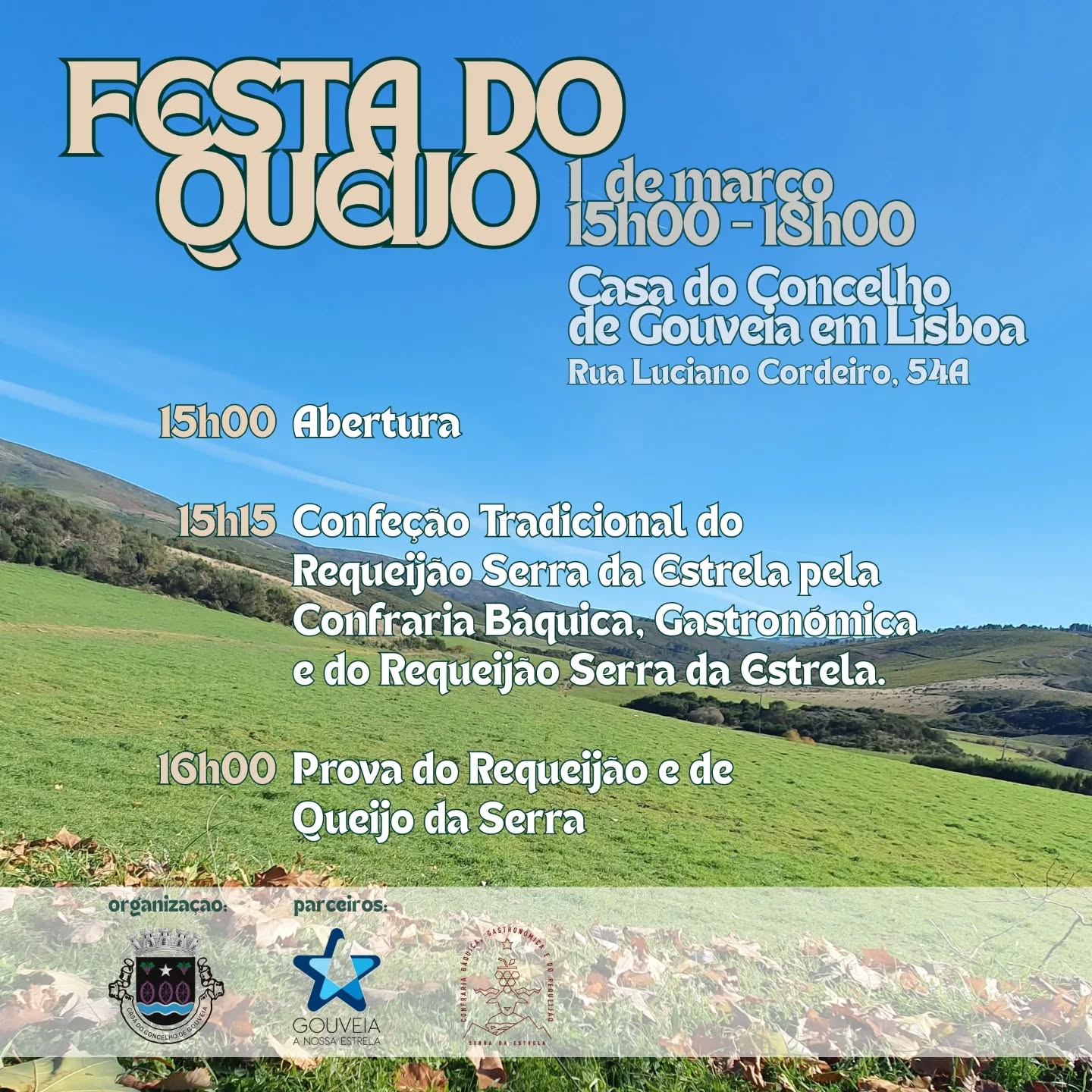 Este domingo, dia 1 de março, a Casa do Concelho de Gouveia em Lisboa voltará a celebrar os produtos endógenos da região da Serra da Estrela na Festa do Queijo, uma iniciativa que já tem tradição nos planos de atividades anuais desta associação e que decorre com regularidade no 1º trimestre do ano, tendencialmente antes do Mercado do Queijo de Gouveia.