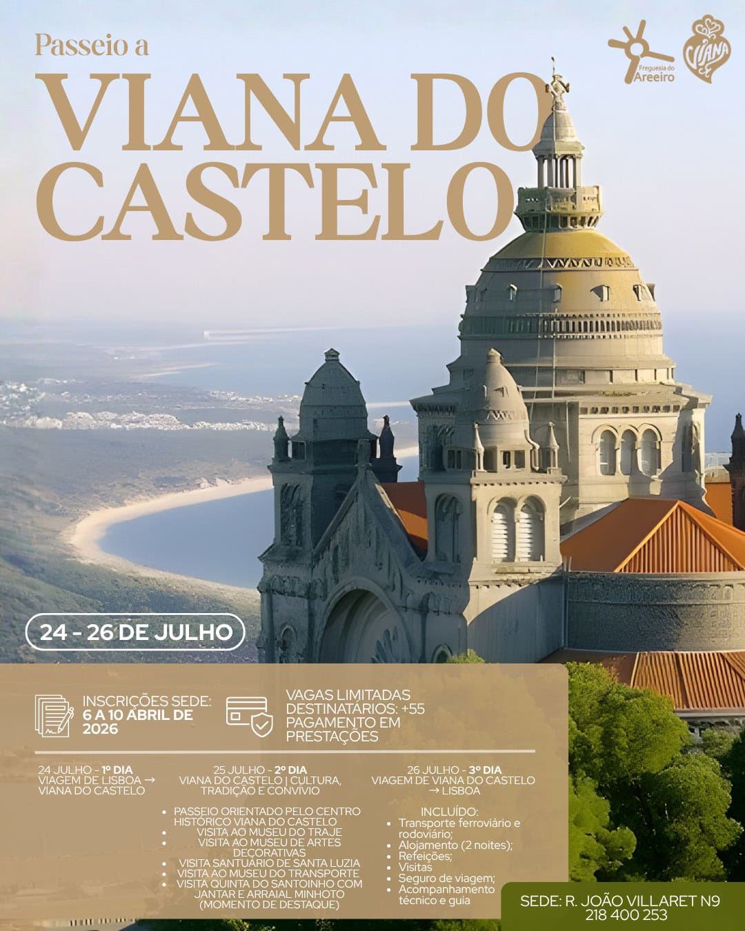 No seguimento das suas políticas de promoção do envelhecimento ativo, a Junta de Freguesia do Areeiro está a organizar um passeio sénior à bela cidade minhota de Viana do Castelo. As inscrições são limitadas e terminam no dia 10 de abril.