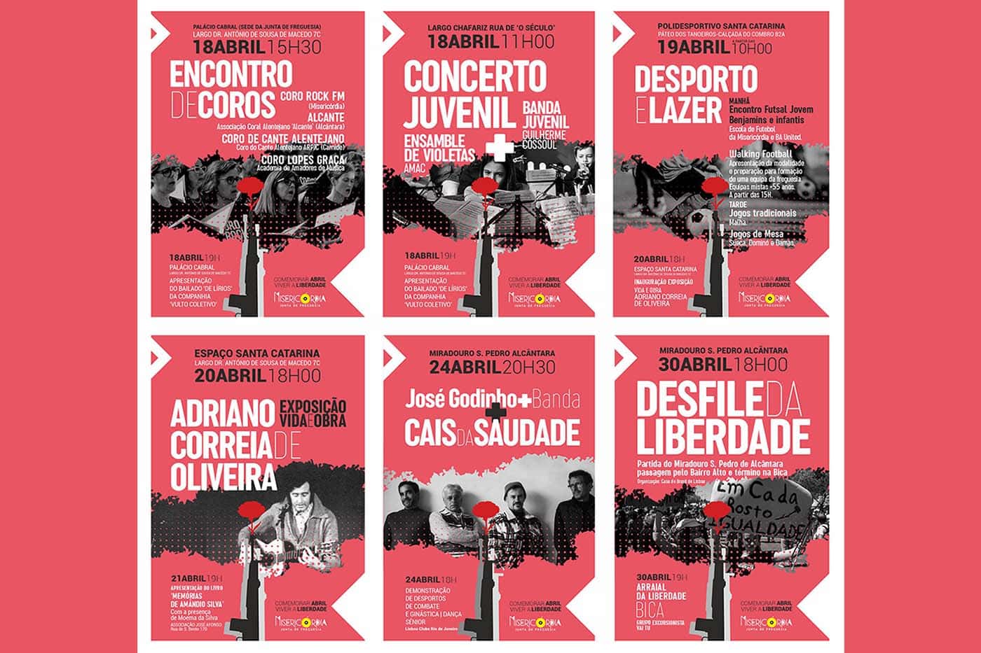 Na mesma data, pelas 21h00, o Miradouro de São Pedro de Alcântara recebe o concerto da banda Entre Cravos e Cordas. O domingo será preenchido com um concerto do trio ‘Canto Ondo – cantem os Poetas!’, no Miradouro de São Pedro de Alcântara. A dia 28, terça-feira, às 10h00, a Escola Básica Gaivotas promove a peça de teatro “Era uma vez um País a preto e branco: Estórias de Abril’, e no último dia da programação, dia 30 de abril, quinta-feira, o Miradouro de São Pedro de Alcântara recebe, pelas 18h00, o ‘Desfile da Liberdade’, com passagem pelo Bairro Alto e término na Bica. À mesma hora, o Espaço Santa Catarina recebe a exibição do filme/documentário ‘A Companhia Disciplinar de Penamacor’, promovida pela Associação InterCulturacidade. Pelas 19h00, dar-se-á início ao Arraial da Liberdade, na Bica, numa iniciativa promovida pelo Grupo Excursionista Vai Tu.