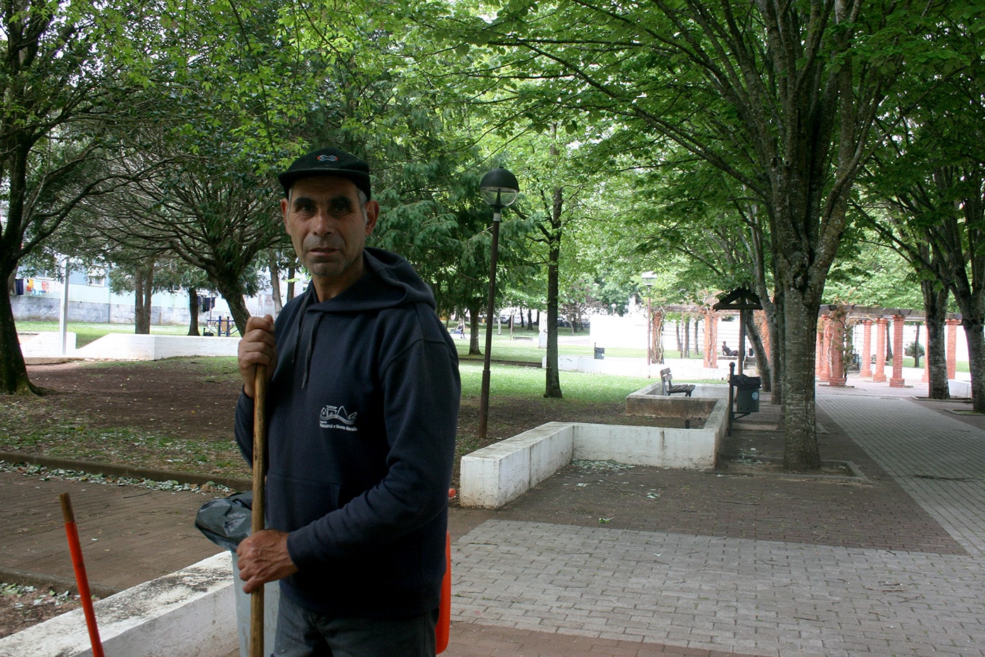 João Oliveira varre com precisão cirúrgica as folhas secas e o lixo acumulado num cantinho do Parque Salgueiro Maia, na União de Freguesias de Massamá e Monte Abraão. Já está informado que o mesmo equipamento municipal vai ser epicentro das celebrações do 25 de Abril do concelho de Sintra.