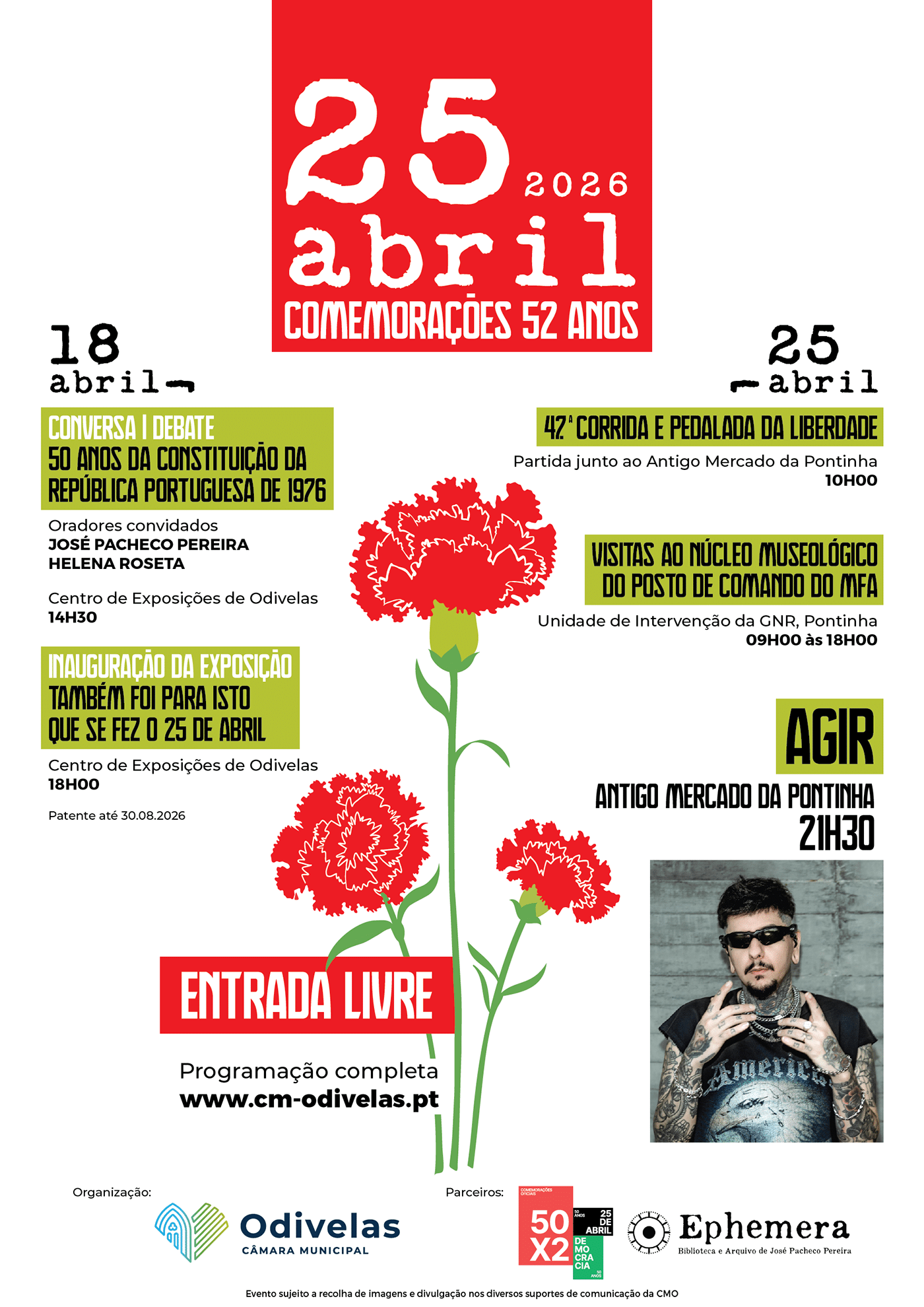 As comemorações do 52.º aniversário da Revolução dos Cravos iniciam com a conversa/debate 50 Anos da Constituição da República Portuguesa de 1976. O debate conta com dois políticos de peso: o historiador e ensaísta José Pacheco Pereira e a arquiteta Helena Roseta (deputada constituinte), às 14h30, do dia 18 de abril, no Centro de Exposições de Odivelas.