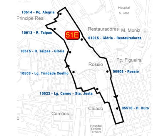A Carris lançou esta sexta-feira uma nova carreira (51E) para servir de alternativa ao elevador da Glória, em Lisboa. A carreira 51E Glória-Circulação Largo do Carmo tem início nos Restauradores e passa pelo Rossio, Rua do Ouro, Rua da Conceição, Rua Nova do Almada, Rua Garrett, Calçada do Sacramento, Largo do Carmo, Largo da Trindade, Rua da Misericórdia, Rua das Taipas, Praça da Alegria e Avenida da Liberdade, regressando depois aos Restauradores.