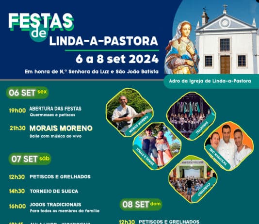 As Festas de Linda-a-Pastora vão decorrer nos dias 6, 7 e 8 de setembro e são uma organização dos Bombeiros de Linda-a-Pastora e da União de Freguesias de Carnaxide e Queijas.