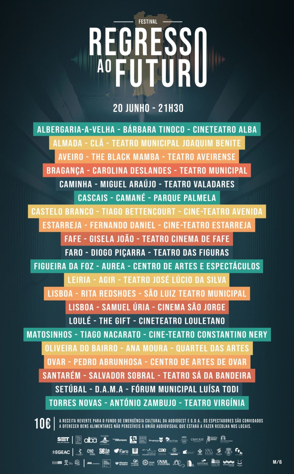 O festival Regresso ao Futuro é a segunda iniciativa musical durante o desconfinamento e marca o regresso de vários artistas portugueses aos palcos, depois do Covid-19 os ter abrigado a cancelar e a reagendar actuações e festejos. Assim, a 20 de junho, 20 teatro municipais, entre eles o de Almada, vão receber músicos nacionais, como Camané, Salvador Sobral, os Clã e os The Gift, numa iniciativa solidária, cuja receita reverterá para um fundo solidário para a cultura, criado pela Audiogest (Associação de produtores musicais) e pela GDA (Gestão dos Direitos dos Artistas)
